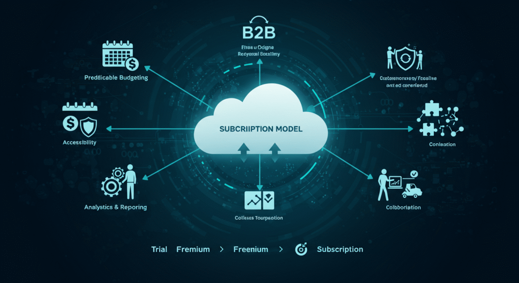 Features like reporting and analytics, and collaboration tools boost efficiency, while trial or freemium options help businesses adopt software before upgrading to a paid subscription.